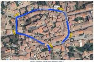 Dès que les travaux seront terminés à l’angle des rues Molière et Marcelin Albert, la rue des Jeïches sera fermée à toute circulation. Une déviation sera mise en place par le Chemin de l’Horte, la rue de Festiano, la rue Molière et la rue Marcelin Albert.